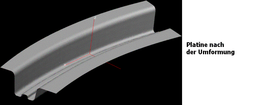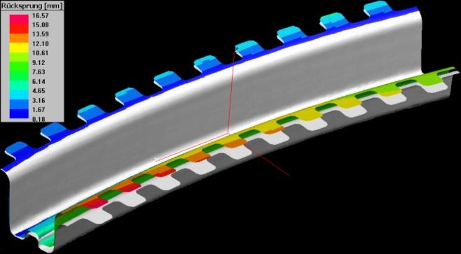 Ein zweiter, im Softwarepaket PAM-AUTOSTAMP integrierter Solver ermöglicht die Simulation des Bauteilrücksprungs nach dem Öffnen der Werkzeuge zwischen den einzelnen Umformstufen, am Ende der Umformung, nach dem Beschnitt mit der Fertigteilkontur oder auch nach dem Abkanten. Im Anschluss an den simulierten Rücksprung können beliebige Schnitte durch das Blech gelegt werden. Diese können im IGES-/VDA-Format gespeichert und so ins CAD-System übernommen werden. Anhand der Schnitte können die Werkzeugflächen soweit geändert werden, dass das Ergebnis nach dem Beschnitt dem Fertigteil lt. Zeichnung entspricht.