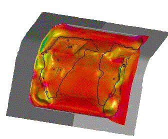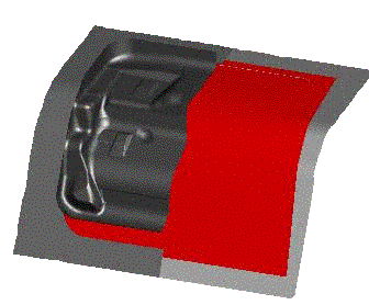 In der letzten Stufe wird das gezogene Blech mit den Fertigteilkonturen beschnitten. Anschließend wird die Rückfederung der Fertigteile nach dem Öffnen der Werkzeuge